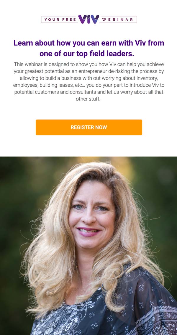 Hey, I’m so glad you are interested in hearing more about Viv! Here is the webinar I told you about, hosted by Viv Consultant Blaney Teal. Blaney loves bringing people together to help support one another toward success, and that’s really what this business is all about! Her energy is contagious, and I hope you enjoy hearing from her. She hosts these Tuesday through Sunday at 8 pm ET, and the webinar will last about 20 minutes. I can’t wait to hear what you think